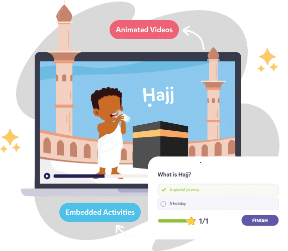 Designed for ages 5–10, Journey2Jannah is our interactive online learning world — helping your child learn Islamic Studies through stories, games, and animations.