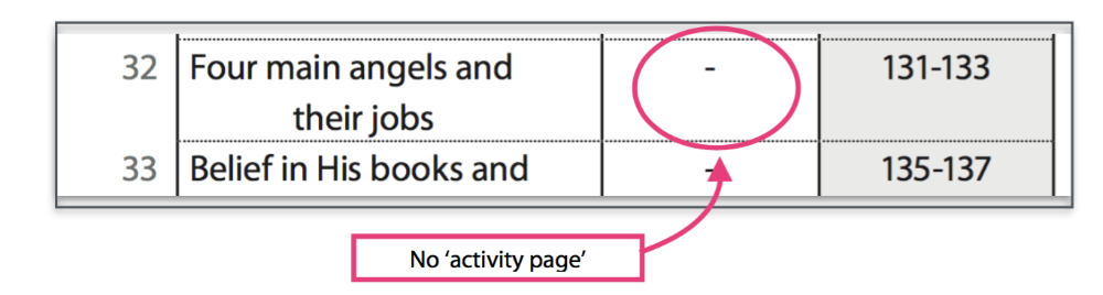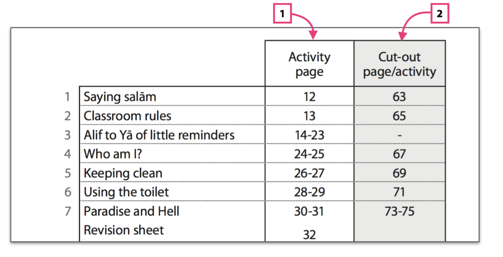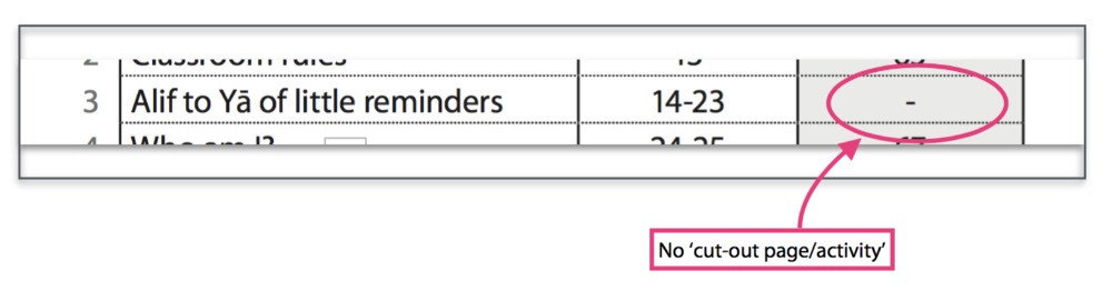 Some chapters will only have activities that require nothing more than colouring, writing or drawing. Therefore, these chapters will not have a ‘cut-out page [or] activity.'The contents will show a blank in the 'cut-out page' column.