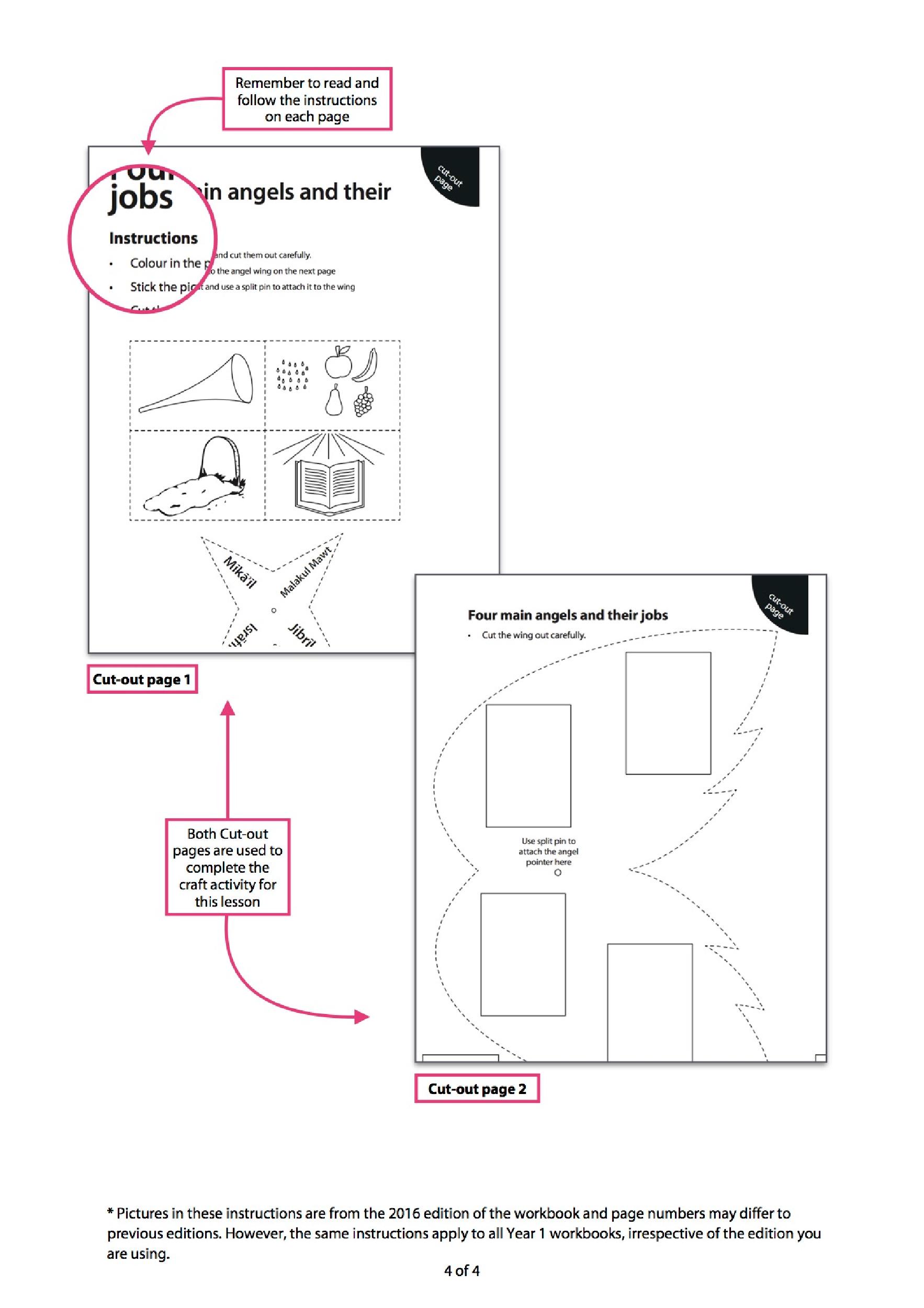 For example, the chapter ‘Four main angels and their jobs’ only has a ‘cut-out activity’ (and no corresponding ‘activity page’) in the workbook. Also, notice that it has two ‘cut-out pages’. Children remove the first ‘cut-out page’ and colour in the pictures. They then cut out the pictures, along with the small pointer on the page. Then, they remove the second ‘cut-out page’ and cut the large angel wing. They then complete the craft task, as per the instructions on the page. In they end, they will have made an angel wing with a pointer, which will allow them to align the name of an angel to a picture of a job that they do.