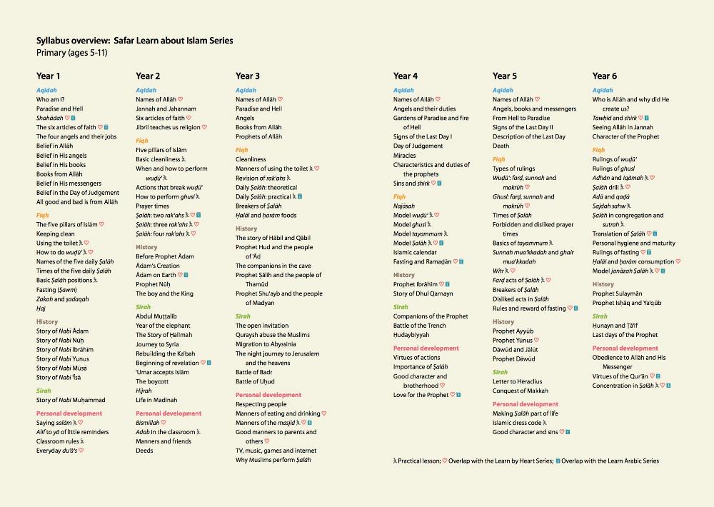 The colour coded tags in the contents group the topic according to five units: Aqīdah, Fiqh, History, Sīrah and Personal development.